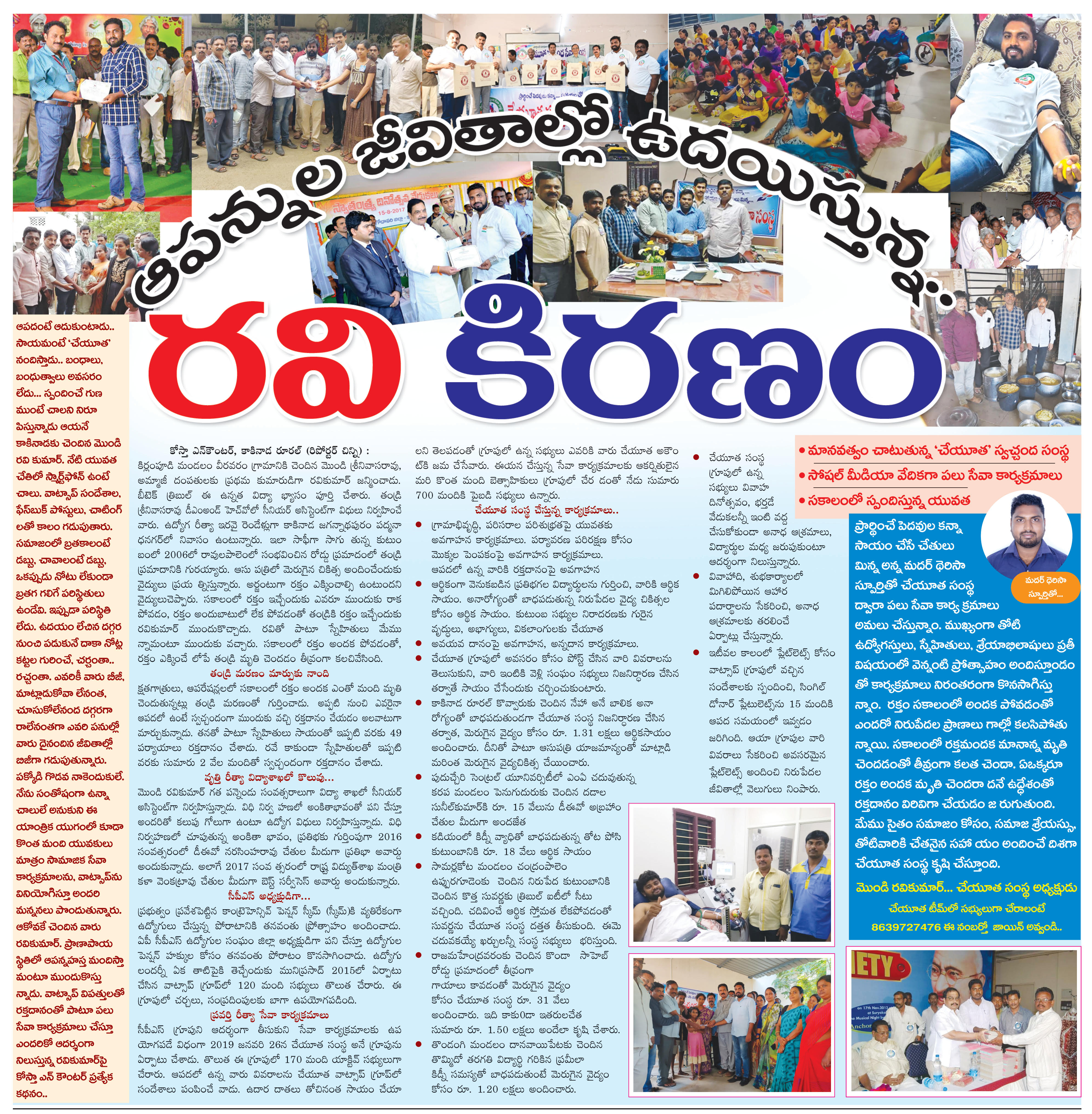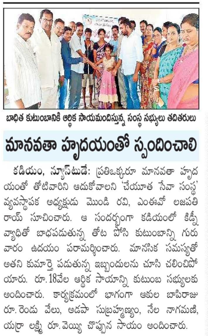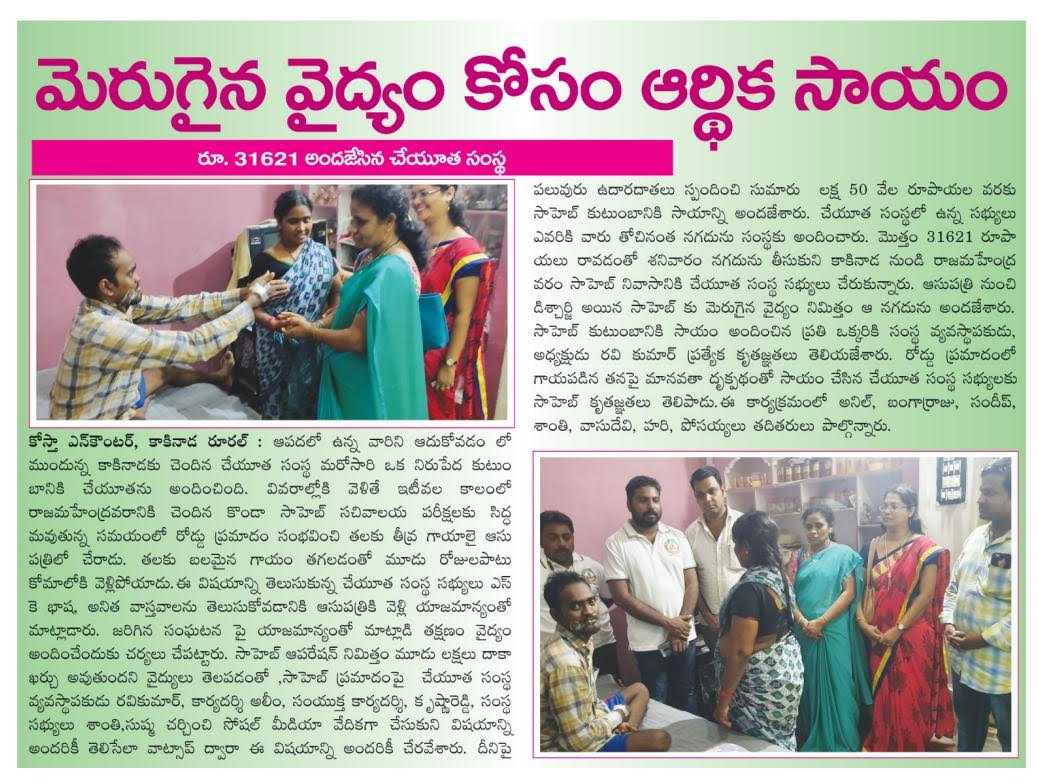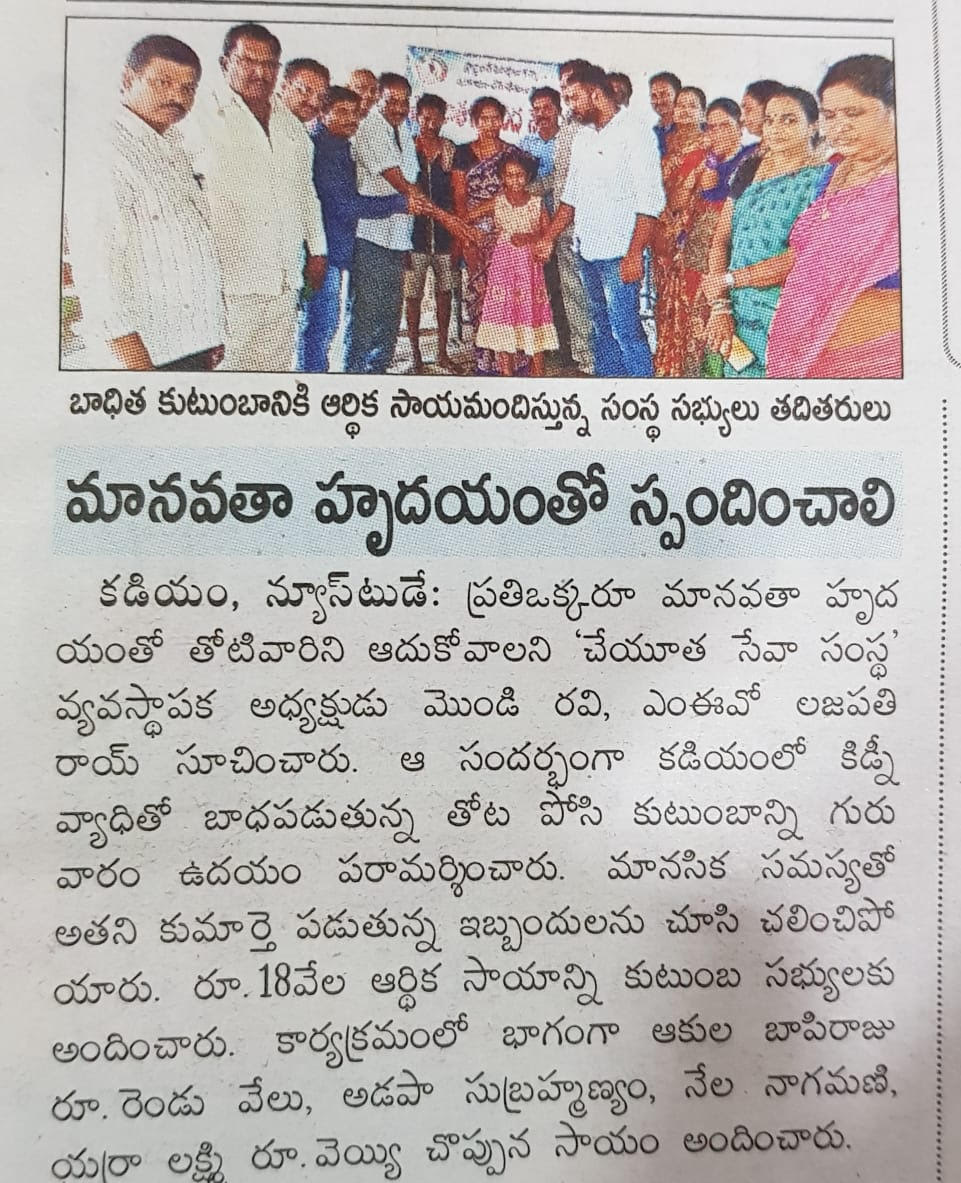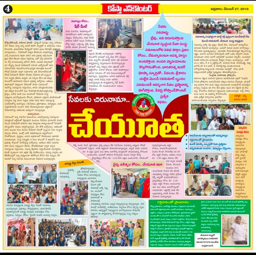Cheyuta Swachhanda Seva Samsta" is inspired by the patriotism of SWAMI VIVEKANANDA, the service motto of MOTHER TERSA, the love of our parents and the values given by our teachers to support the less fortunate people around us. We believe that "helping hands are better than praying lips" as Mother Teresa said! Cheyuta Swachhanda Seva Samsta is a ray of sunshine in today's scenario where we're slowly loosing the sight of basic human relations